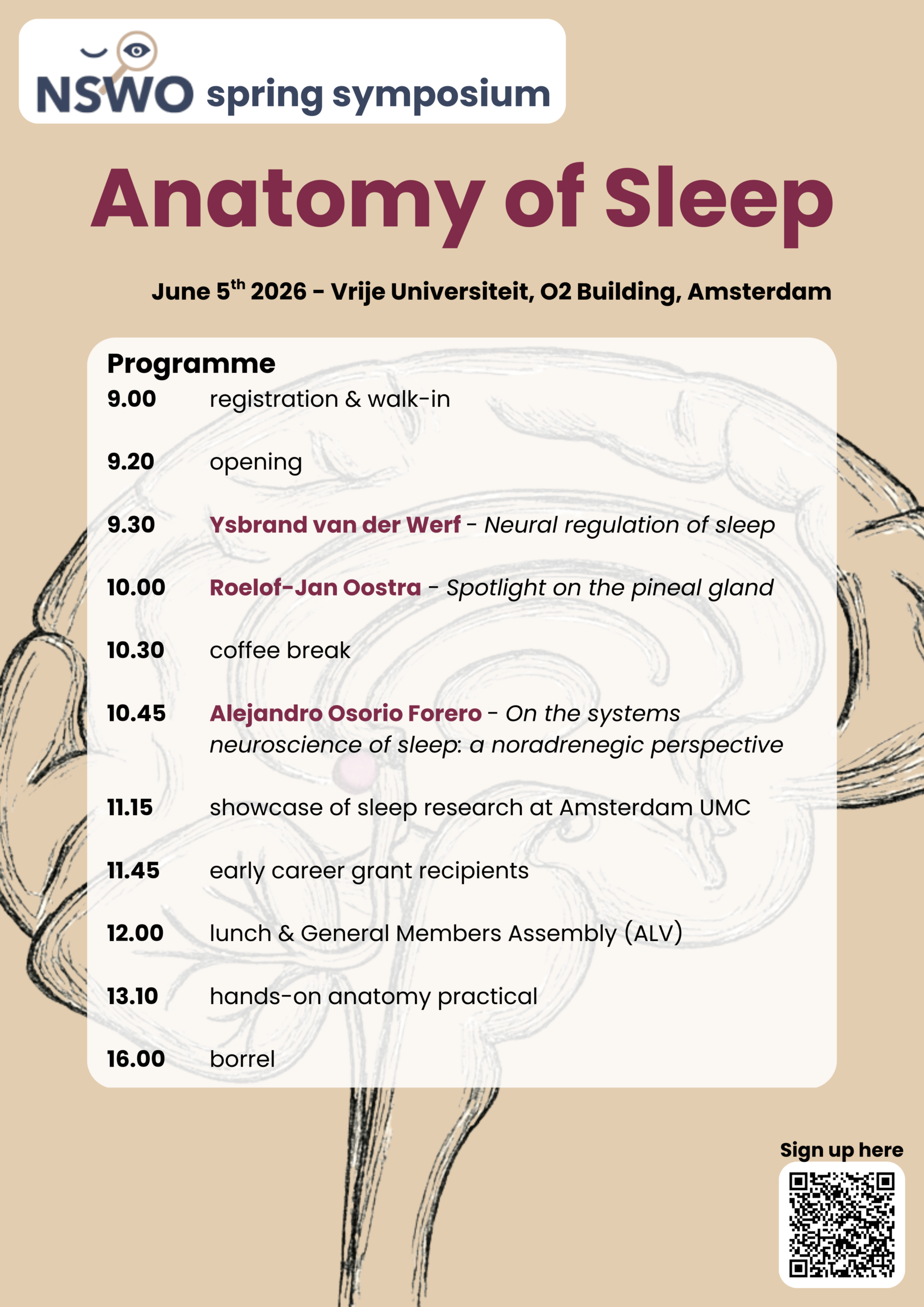 The NSWO Spring Symposium titled “The Anatomy of Sleep” will explore the biology and neuroanatomy of sleep, delving into the brain regions, structures, and mechanisms that underlie sleep regulation. The morning program will feature inspiring talks by experts in the field, followed by an afternoon of anatomy demonstration in the dissection room, and will conclude with an informal networking borrel.